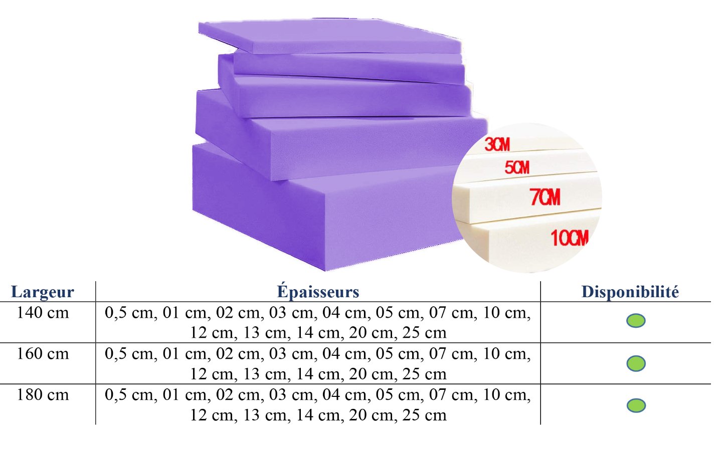 Ces blocs de cette qualité sont Proposés avec une longueur de 190 cm, un choix de largeurs de : 140 cm, 160 cm ou 180 cm ainsi qu’un choix d’épaisseurs de : 0,5 cm, 1 cm, 2 cm, 3 cm, 5 cm, 7 cm, 10 cm, 12 cm, 13 cm, 14 cm, 20 cm, 25 cm ou 100 cm. Cette gamme s’adapte à toutes les exigences professionnelles.