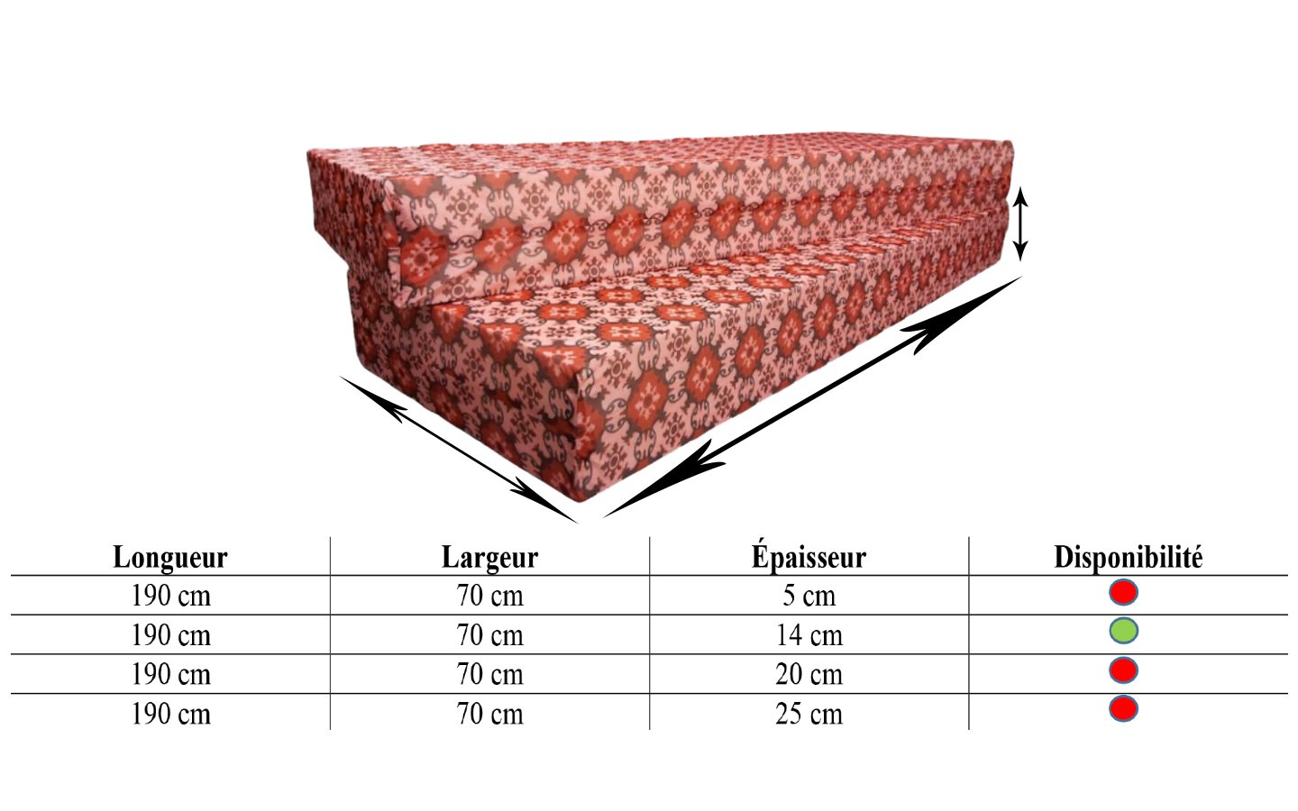 Ces matelas de cette qualité sont proposés avec une longueur de 190 cm, une largeur de 70 cm et une épaisseur de 14 cm, avec une Housse en jersey.