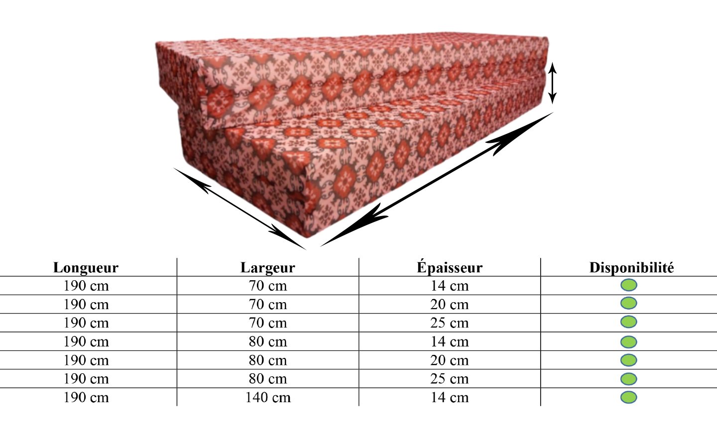 Ces matelas de cette qualité sont proposés avec une longueur de 190 cm, un choix de largeurs de : 70 cm, 80 cm, 140 cm, ainsi qu’un choix d’épaisseurs de : 14 cm, 20 cm et 25 cm, avec une Housse en jersey.