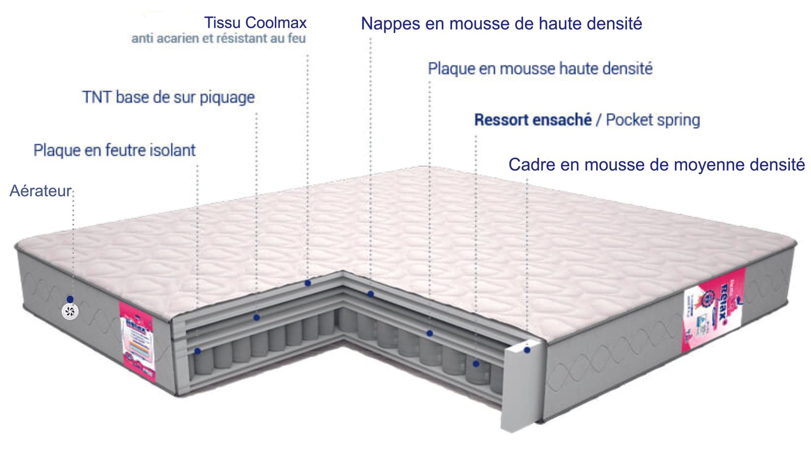 • 1 nappe en Coolmax® de chaque côté, d’une densité de 400 g/m²: Matelassé, Thermorégulant, Anti-acariens, Antibactérien et Résistant au feu