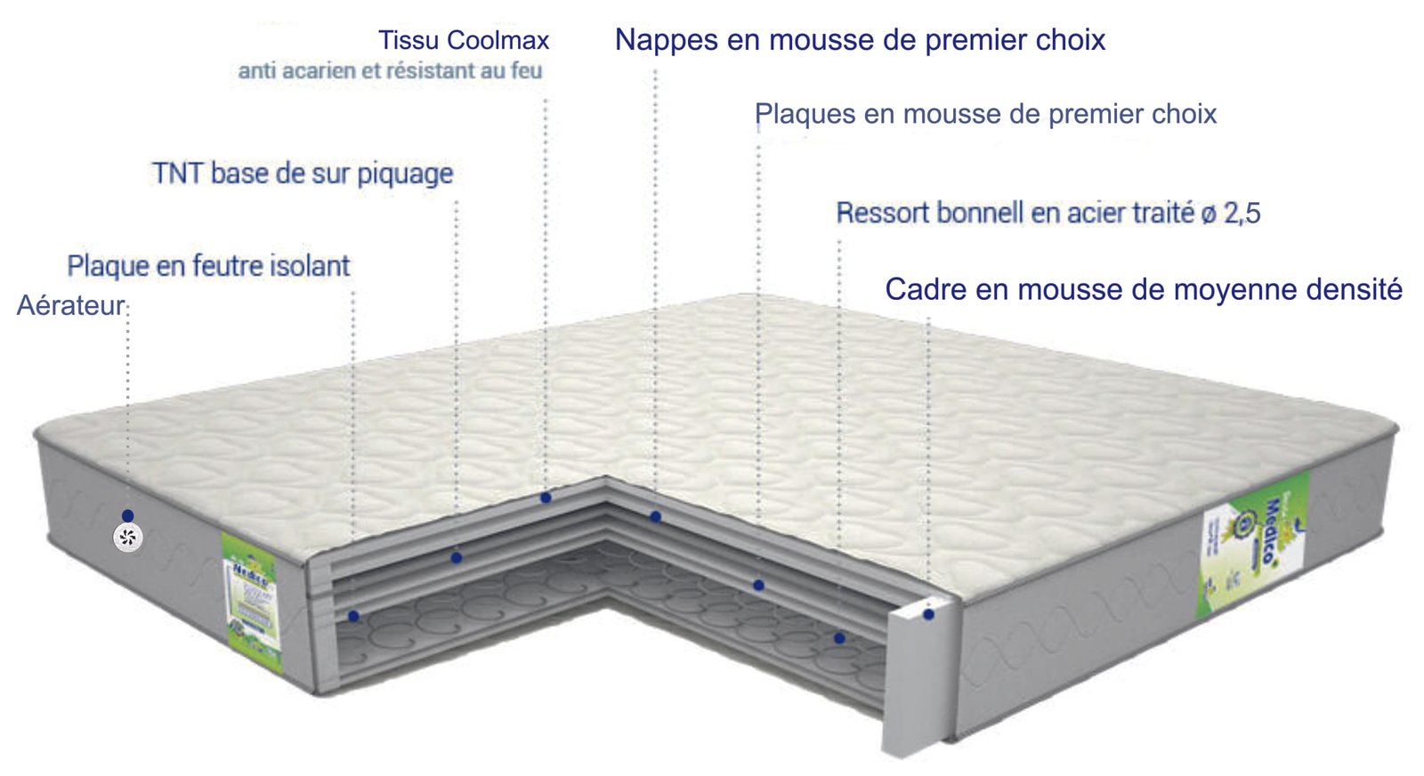 - 1 nappe en Coolmax® de chaque côté, d’une densité de 350 g/m² : Matelassé , Thermorégulant , Anti-acariens , Antibactérien et Résistant au feu ,