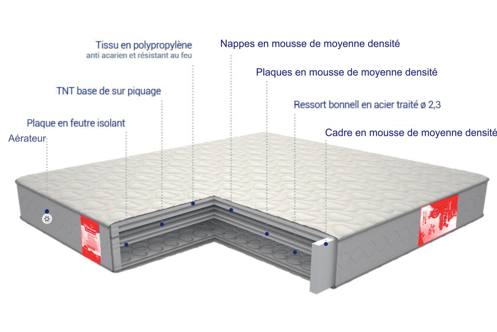 Un cadre en Mousse Polyuréthanne , d’une densité de 20/22 kg/m³ , d’une épaisseur de 6,5 cm et d’une hauteur de 15 cm , complète la structure pour garantir un confort adapté à un usage quotidien ou occasionnel .