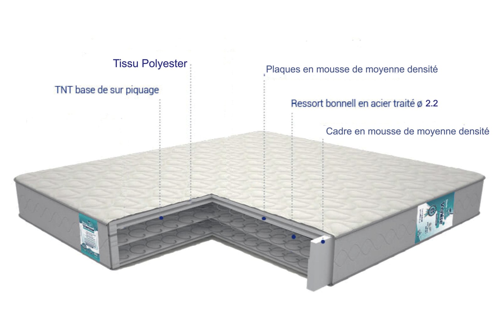 Un cadre en Mousse Polyuréthanne, d’une densité de 12/14 kg/m³, d’une épaisseur de 6,5 cm et d’une hauteur de 15 cm, complète la structure pour garantir un confort adapté à un usage quotidien ou occasionnel.