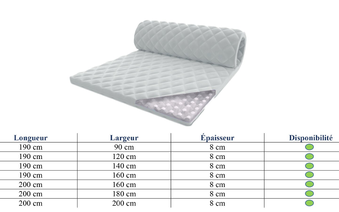 Ce type de Surmatelas est proposé en deux longueurs (190 cm et 200 cm), en plusieurs largeurs (90 cm, 120 cm, 140 cm, 160 cm, 180 cm et 200 cm) et avec une épaisseur de 8 cm.