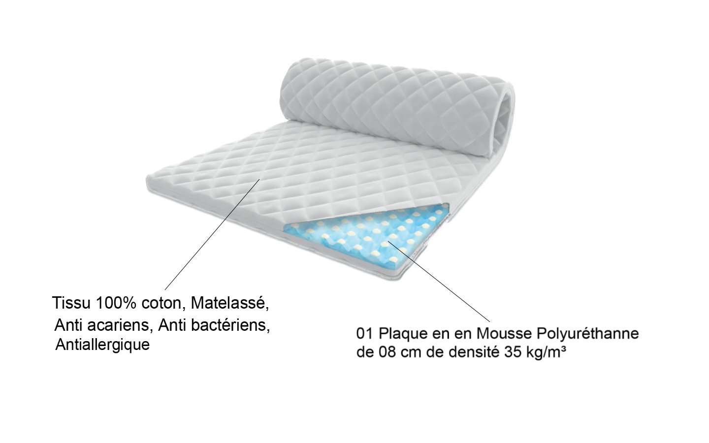 Ce type de Surmatelas est proposé en deux longueurs (190 cm et 200 cm), en plusieurs largeurs (90 cm, 120 cm, 140 cm, 160 cm, 180 cm et 200 cm) et avec une épaisseur de 8 cm.